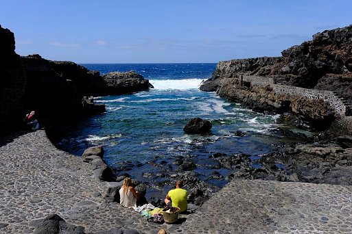 An der über 110 km langen Küste El Hierros wechseln sich wild anmutende Lavalandschaften, mit steilen Klippen, langen Steinstränden, Buchten und vereinzelten kleinen Sandstränden ab. Erst in den letzten 20 Jahren wurden mit Natursteinen und Mäuerchen sehr schöne Badestellen angelegt, an denen man per Leiter, Steg oder Treppe sicher ins Wasser gelangen kann. Hier geben sich die Insulaner gemeinsam mit den Feriengästen Badefreuden hin und schwimmen teils weite Strecken entlang der Küste.