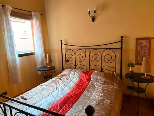In dem in warmen Farbtönen gehaltenen Schlafzimmer stehen ein gusseisernes Doppelbett und ein großer eingebauter Holzschrank.