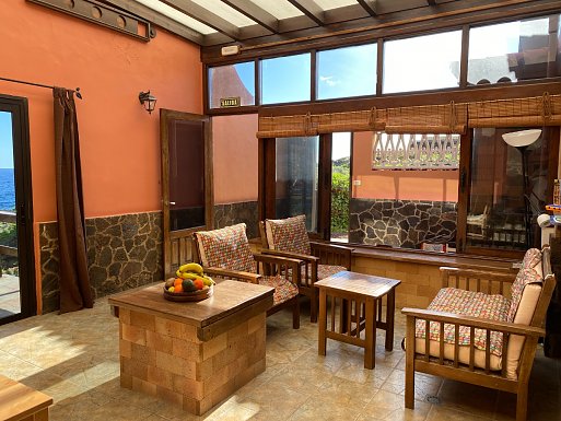 Dem Zusammenspiel von Licht, schönen Fliesen, Natursteinen, Fenstern, warmen Farben und Holzmöbeln verdankt der Wintergarten sein ganz besonderes, stilvolles und gemütliches Ambiente. Eine Sitzecke lädt zum Verweilen ein und bei der Durchreiche zur Küche steht ein Holztisch mit 4 Stühlen. Eine gläserne Schiebetür führt auf die Terrasse mit wunderschönem Meerblick.
