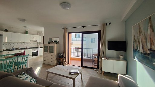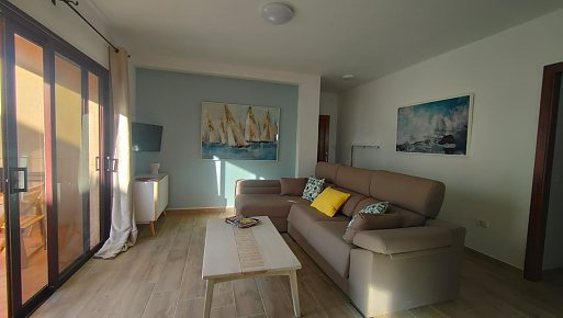 Das helle und geräumige Wohnzimmer ist durch Glastüren von dem Balkon mit seitlichem Meerblick getrennt. Die geschmackvolle Einrichtung sorgt für ein angenehmes Ambiente, das große, sehr bequeme Sofa lädt zum Verweilen ein und der Fernseher hängt dezent davor in einer Ecke.