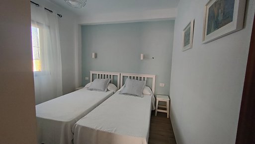 Im kleineren Schlafraum befinden sich zwei Einzelbetten, geräumige Wandschränke und ein Fenster.