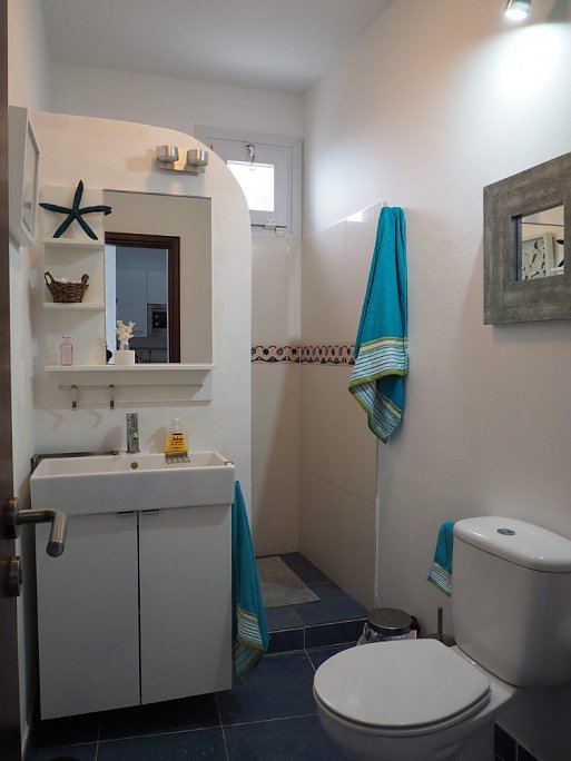 Das hübsche, in weiß gehaltene Bad liegt auf derselben Etage und verfügt über eine Duschkabine, ein Waschbecken und WC. Abstellfläche für Ihre Kosmetikartikel ist vorhanden.