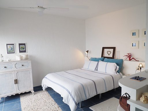 Von der Eingangstür führt eine Treppe direkt in das lichtdurchflutete, geschmackvoll und modern eingerichtete Wohnzimmer mit herrlichem Meerblick. Ein gläserner Eßtisch mit 4 Stühlen steht vor den großen Fenstern im Zentrum des Raumes. In der Ecke daneben können Sie es sich auf dem Sofa bequem machen oder es zu einem Doppelbett ausziehen. Die Vitrine neben dem Eingang und das gemauerte Regal sind als Ablage für Ihre Utensilien gedacht.
