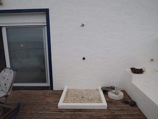 Die große, mit Liegen und Tisch nebst Stühlen ausgestattete Terrasse, lädt zu einem Sonnenbad ein und bietet Ihnen eine gute Aussicht. Sehr originell ist die Außendusche mit der gemauerten Liege daneben.