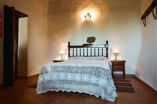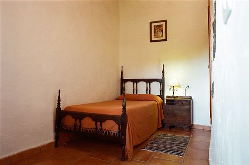 Im Schlafzimmer steht ein 1,50 × 1,90 m großes, antikes Doppelbett. Aus der Einfassung des alten Einbauschrankes heben sich schwarze Steine hervor und die Tür paßt gut zu dem mit Holz verkleideten Dach. Ein kleiner Sekretär mit geschnitztem Stuhl, eine Lampe und ein Spiegel runden den klassisch, rustikalen Gesamteindruck ab.