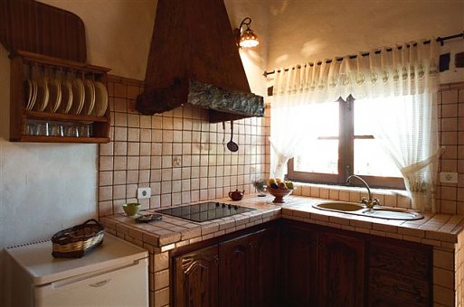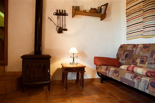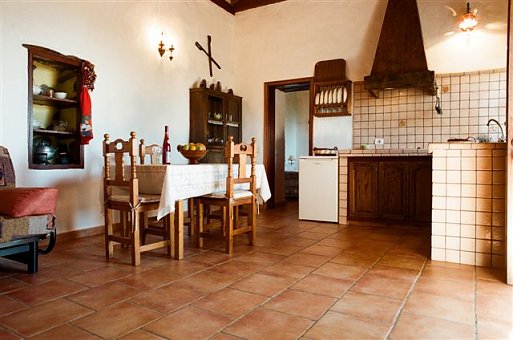 Die Wohnküche ist das Herzstück La Jaritas, von hier gelangt man in das Schlafzimmer und ins Bad. Neben dem gut funktionierenden Bollerofen steht ein Sofa, das bei Bedarf zu einem Doppelbett umfunktioniert werden kann. An dem rustikalen Esstisch hat die ganze Familie Platz und die antiken Regale unterstreichen den bäuerlichen Charakter des Hauses.