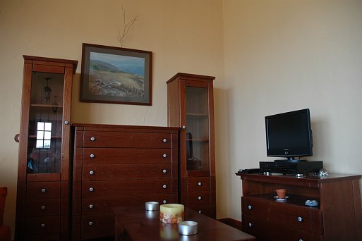 In der gemütlichen Sitzecke stehen 2 bequeme Sofas vor einem Tischchen und auf einer Vitrine der Fernseher und die kleine Musikanlage.