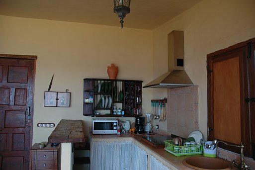Betritt man das Haus durch die stabile und originelle Eingangstür, teilt ein Holztresen die sehr gut mit nützlichen Utensilien ausgestattete rustikale Küche vom Wohnbereich. Zu ihrer Einrichtung gehören ein großer Kühlschrank, ein Ceranfeld Herd mit Abzugshaube, eine Mikrowelle, ein Toaster, ein Wasserkocher und eine Kaffeemaschine. Das Geschirr kann an der runden Spüle mit Meerblick abwaschen werden.