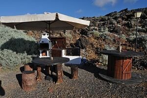 In der naturbelassenen Umgebung vor dem Haus und neben den schwarzen Lavafelsen wurde ein Grillplatz mit Feuerstelle, Backofen, Grill Werkzeugen, Tischen, Bänken und einem grossen Sonnenschirm angelegt.