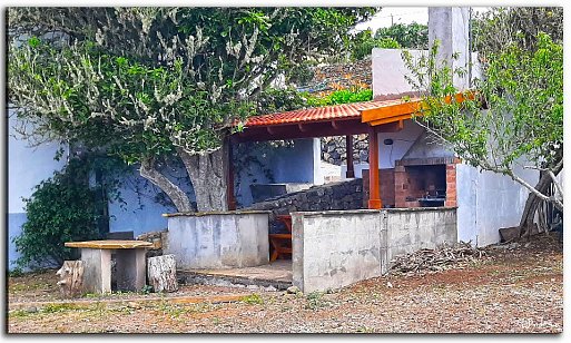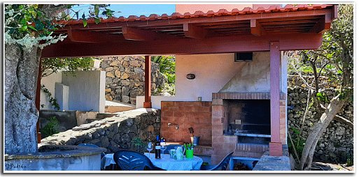 Unten, dicht am Haus liegt im Schatten eines ausufernden Orangenbaumes die sehr originelle Grillstelle mit Tisch, Stühlen und Bänken.