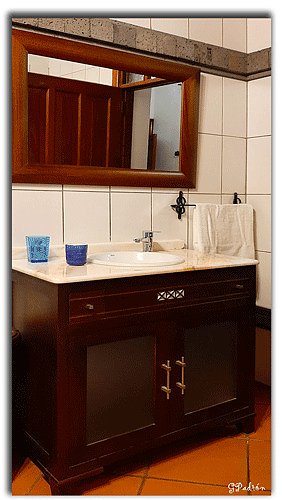 Das kleine, aber feine, stimmungsvolle Badezimmer ist geschmackvoll mit Regalen, einer komfortablen Dusche, einem Waschbecken und WC eingerichtet. Die Schönheit der Zweige und Früchte des alten, großen Zitronenbaumes lässt sich aus dem Fenster bewundern.